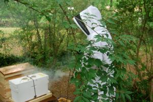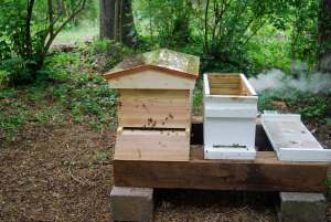 Here, I removed the nuc box from the hive bottom board and replaced it with the actual brood box. Some of the guard bees were zooming around and became a little defensive, so I grabbed my smoker and puff puffed some smoke.