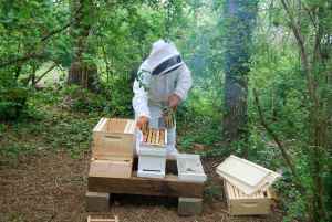 Here, I am placing frames in the new hive body carefully without crushing any bees.