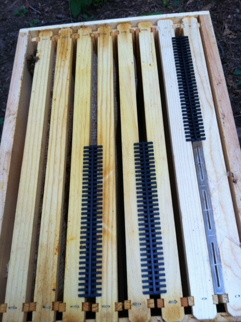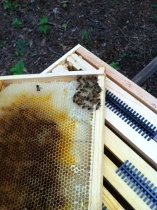 I began writing this post towards the end of July 2011 when at the time only a few bees including the queen were huddled on the left hand corner of the frame. This is the  hive I started  from 3lbs of packaged bees. The hive seemed to be doing well during the first three to four weeks but quickly began its decline trying to ward off the small hive beetles (SHB). Unfortunately, the first week of August 2011, they finally succumbed to the small hive beetles. It was truly a tough fight.  I did my best as a beginner but with limited experience my best was not good enough.  I tried making my own SHB traps out of tupperware that I punctured with holes and then added  old banana peels and apple cider; based on some  of my research, I thought that this might control them, but it didn’t.  I also tried SHB beetle jails that I purchased–that didn’t work either.  I finally tried the Fat Man Beetle trap after learning about it from my internet research, and it worked for a little while but ultimately was no match for the persistent efforts put forth by the small hive beetles. While the battle with this hive was lost, the hive I started from a nuc continues to win . This particular colony is strong and  it is controlling the SHB. I am now truly glad I started two hives instead of one.  I know now that in my heavily wooded area where the hive beetles are seemingly in abundance that a nuc of bees has a better chance of surviving than a package of bees.  Stay tuned for updates as my beekeeping journey moves forward.